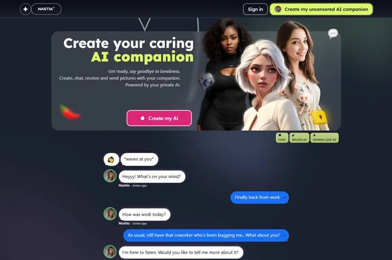 Nastia.ai is an AI companion platform designed to provide human-like conversations, emotional support, and personalized interaction through chat, voice, images, and roleplay features. At its core, Nastia AI leverages advanced large language models (LLMs) combined with multimedia generation tools to create a personal, always-available digital companion. The platform focuses heavily on authentic communication and emotional connection, positioning itself not just as an entertainment tool but also as a wellness-oriented AI assistant.